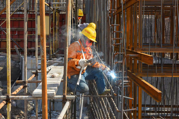 在白馬渠江特大橋拼裝加工場內(nèi),來自重慶市合川區(qū)的工人王家榮正和幾名工友一道,頭頂烈日在6米高的索塔安裝操作平臺上焊接加固鋼筋。