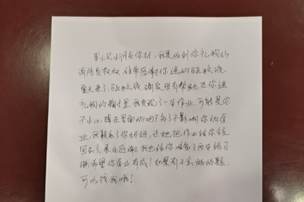 最終,5月4日,“五一”假期最后一天,小女孩的媽媽來(lái)到百安壩消防救援站取回了女兒的練習(xí)冊(cè),并帶回了消防員精心準(zhǔn)備的回贈(zèng)禮物--另外兩本練習(xí)冊(cè)和一封手寫的感謝信。