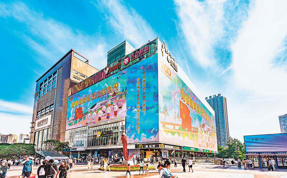5月7日,江北區(qū)觀音橋商圈,大屏幕上滾動播放“青春心向黨 建功新時(shí)代”等主題標(biāo)語。
