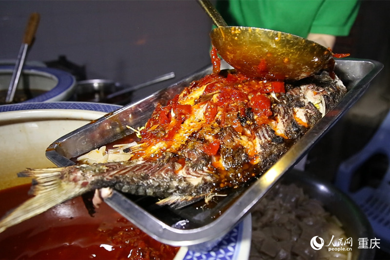 烤魚出爐后淋上泡椒醬。人民網(wǎng) 劉祎攝