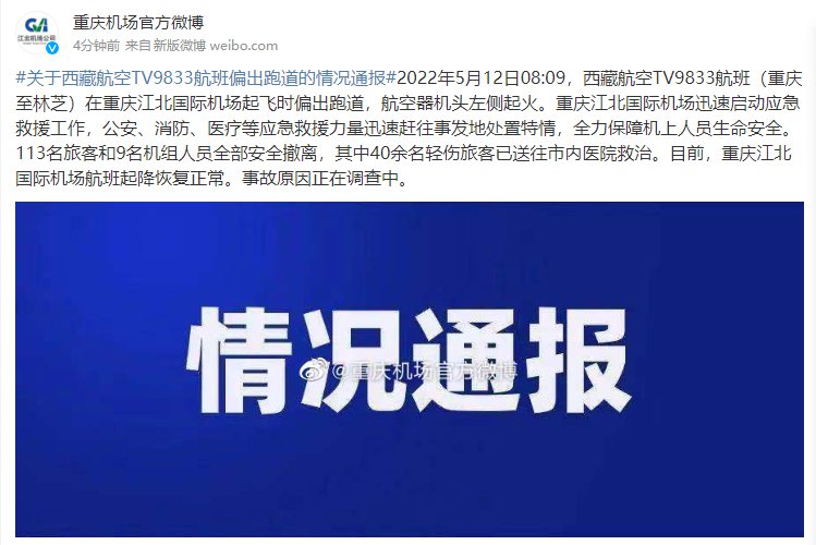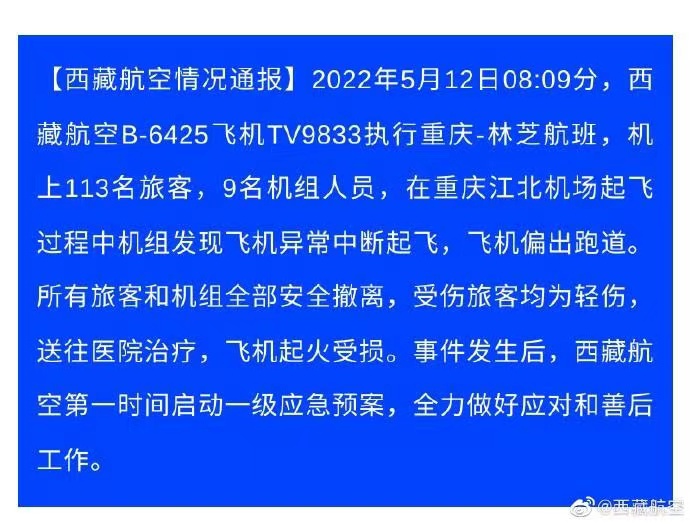 - 西藏航空官方微博截圖。 人民網(wǎng)重慶5月12日電 (陳琦、劉敏)西藏航空情況通報(bào),2022年5月12日08:09分,西藏航空B-6425飛機(jī)TV9833執(zhí)行重慶-林芝航班,機(jī)上113名旅客,9名機(jī)組人員,在重慶江北機(jī)場(chǎng)起飛過程中機(jī)組發(fā)現(xiàn)飛機(jī)異常中斷起飛,飛機(jī)偏出跑道!