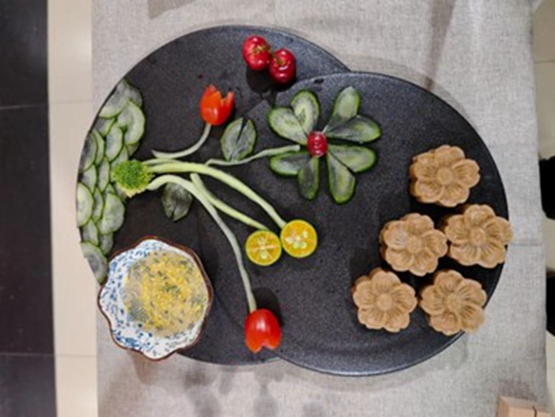 比賽現(xiàn)場,日常的湯羹、糕點、涼菜,通過護(hù)理人員的手,巧妙地加入芡實、通草、川貝等中醫(yī)藥元素,呈現(xiàn)出“郁金香伴”“太極四味”“益氣補血花膠雞湯”“荷塘爭艷”等極有創(chuàng)意、同時兼顧視覺美和味覺美的中醫(yī)藥特色美食,引得現(xiàn)場員工、患者紛紛駐足品嘗,并發(fā)圖分享到朋友圈,助力中醫(yī)藥文化傳播。