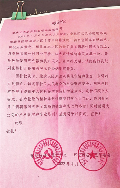 看著火災(zāi)撲滅,胡朝偉悄然離開了現(xiàn)場(chǎng)。次日,該小區(qū)的物業(yè)經(jīng)過(guò)多番打聽(tīng),才得知了胡朝偉的工作單位和聯(lián)系方式,并向他所在單位送去了感謝信!白鳛橐幻h員、一名退伍軍人、一名單位的消防教員,這是我應(yīng)該做的。”看到感謝信后,胡朝偉平淡地說(shuō)。(楊薈琳)