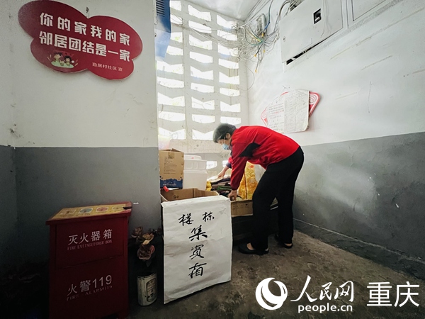 居民在整理樓棟集資箱內(nèi)的可回收物。人民網(wǎng) 胡虹攝