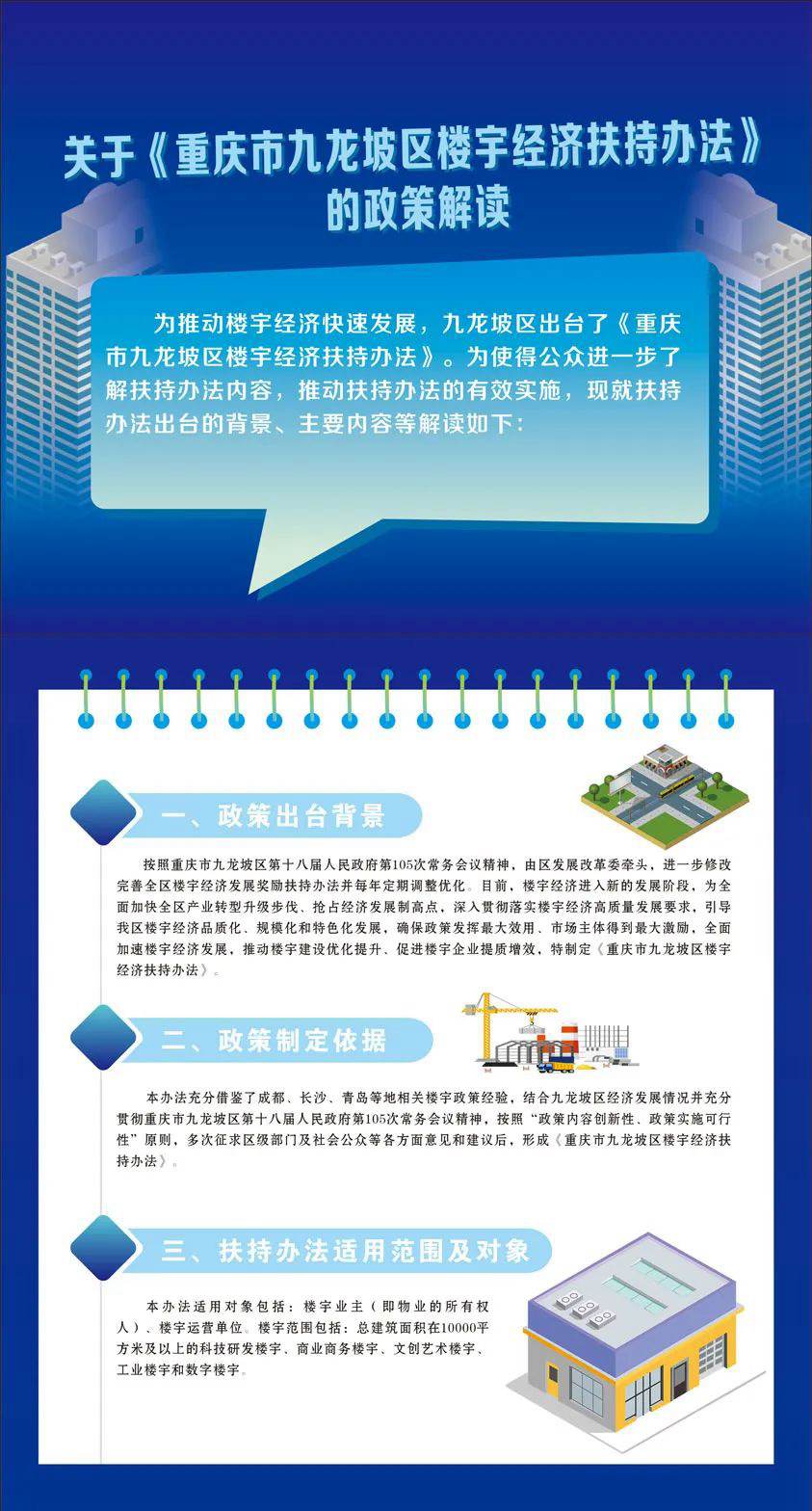 大力發(fā)展樓宇集聚區(qū)、鼓勵新建樓宇開發(fā)運(yùn)營、鼓勵打造特色樓宇……近日,為加快全區(qū)產(chǎn)業(yè)轉(zhuǎn)型升級步伐、搶占經(jīng)濟(jì)發(fā)展制高點(diǎn),深入貫徹落實(shí)高質(zhì)量發(fā)展要求,推進(jìn)樓宇服務(wù)生態(tài)圈建設(shè),引導(dǎo)九龍坡區(qū)樓宇經(jīng)濟(jì)品質(zhì)化、規(guī);吞厣l(fā)展,九龍坡區(qū)根據(jù)全區(qū)經(jīng)濟(jì)社會發(fā)展形勢和重點(diǎn)扶持行業(yè)領(lǐng)域變化情況,在對既有扶持辦法進(jìn)行修訂完善后形成《重慶市九龍坡區(qū)樓宇經(jīng)濟(jì)扶持辦法》(以下簡稱《扶持辦法》)。