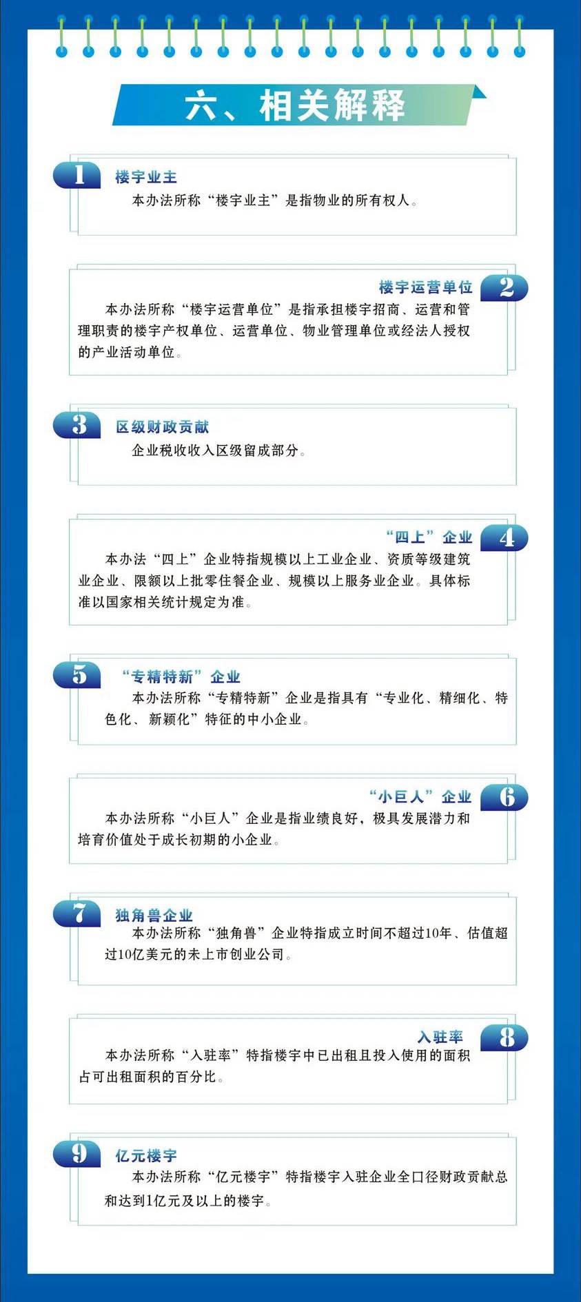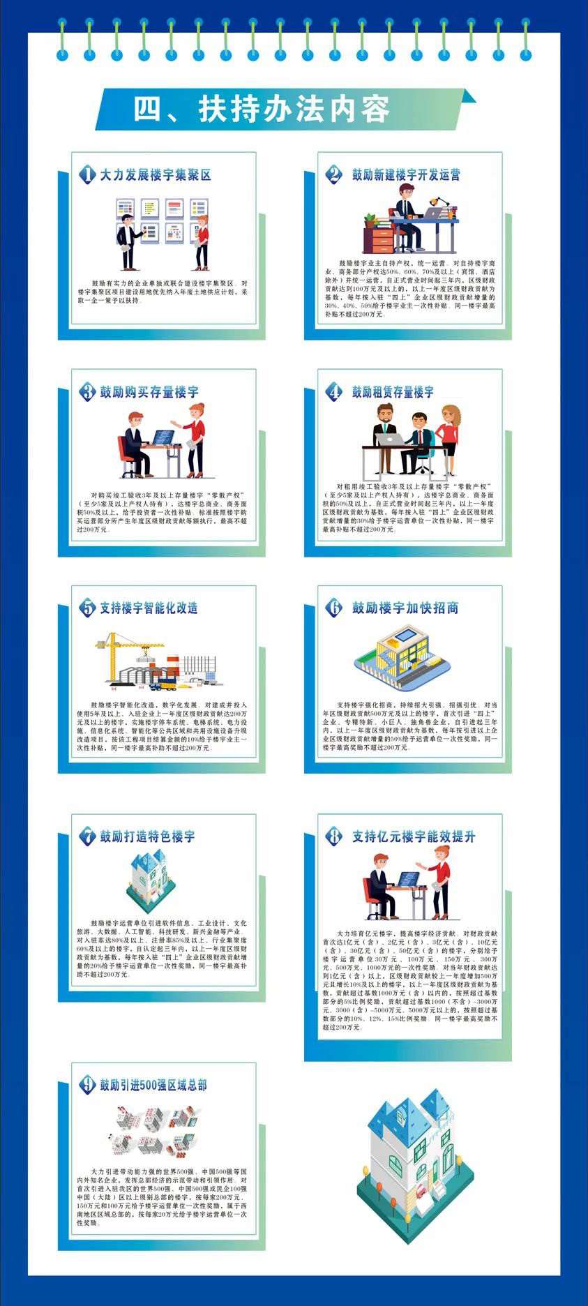該《扶持辦法》適用對象包括:樓宇業(yè)主(即物業(yè)的所有權(quán)人)、樓宇運(yùn)營單位。樓宇范圍包括:總建筑面積在10000平方米及以上的科技研發(fā)樓宇、商業(yè)商務(wù)樓宇、文創(chuàng)藝術(shù)樓宇、工業(yè)樓宇和數(shù)字樓宇。扶持政策包括大力發(fā)展樓宇集聚區(qū)、鼓勵新建樓宇開發(fā)運(yùn)營、鼓勵購買存量樓宇、鼓勵租賃存量樓宇、支持樓宇智能化改造、鼓勵樓宇加快招商等9條政策。