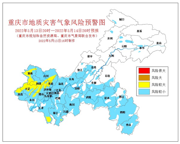 5月13日16時,重慶市規(guī)劃和自然資源局、重慶市氣象局聯合發(fā)布全市地質災害氣象風險預警。