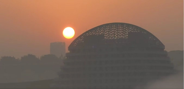 紅日緩緩升起,層層薄霧籠罩下的悅來國際會展城漸漸蘇醒,氣勢磅礴的大型建筑仿佛鍍上了一層金邊,列車穿梭在“云端”,動漫般夢幻的場景宛若“天空之城”。繼前段時間火出圈的《云海列車》,其拍攝者周能又帶來了新一輪作品——《云!倎怼贰