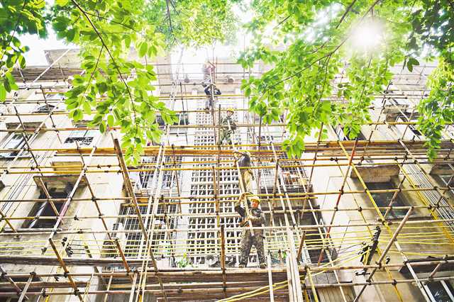 5月7日,巴南區(qū)李家沱街道渝紗社區(qū),實(shí)施老舊小區(qū)改造的工人正在傳遞建筑材料。