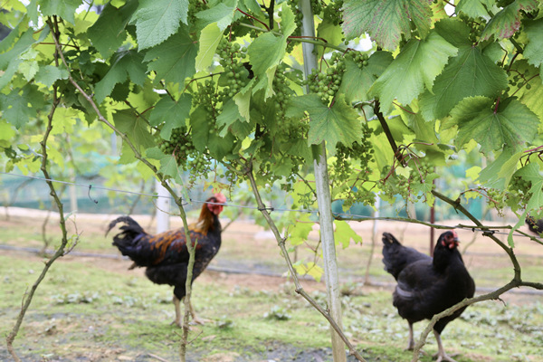 葡萄樹下的溜達(dá)雞與葡萄共生長。楊孝永攝