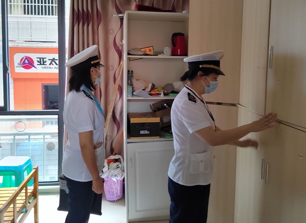 衛(wèi)生監(jiān)督員在住宿單位檢查。江津區(qū)衛(wèi)生健康綜合行政執(zhí)法支隊(duì)供圖