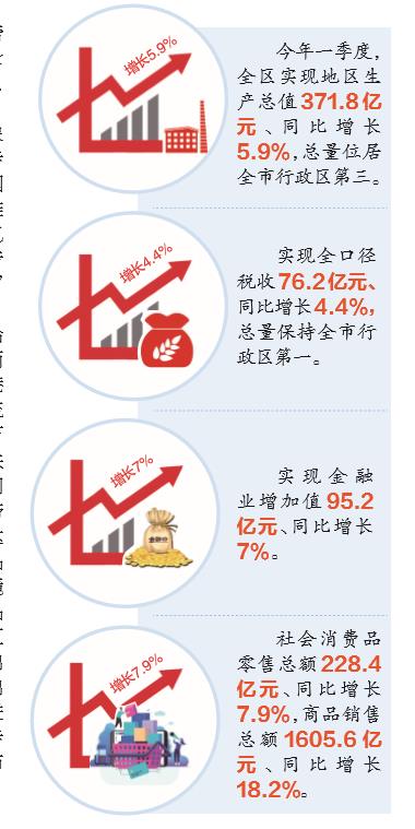喜事連連的背后,是打造西部金融中心核心承載區(qū)和培育建設國際消費中心城市首選區(qū)的魄力和能力,是江北區(qū)主動挑起“兩副擔子”的底氣和決心。今年一季度,全區(qū)實現(xiàn)地區(qū)生產(chǎn)總值371.8億元、同比增長5.9%,總量位居全市行政區(qū)第三。實現(xiàn)全口徑稅收76.2億元、同比增長4.4%,總量保持全市行政區(qū)第一;實現(xiàn)金融業(yè)增加值95.2億元、同比增長7%;社會消費品零售總額228.4億元、同比增長7.9%,商品銷售總額1605.6億元、同比增長18.2%。