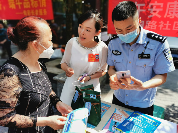 民警和志愿者為居民送上端午禮包時(shí)進(jìn)行反詐宣傳;嘏d街道供圖