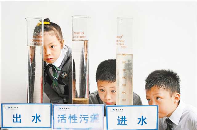 5月28日,悅來污水處理廠,幾名參加開放日活動(dòng)的小學(xué)生觀察污水處理廠不同工藝環(huán)節(jié)水體樣本。記者 萬難 攝/視覺重慶