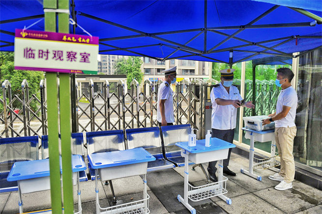 6月2日,聯(lián)合執(zhí)法組的隊員正在對考點的疫情防控設(shè)施進(jìn)行檢查。崔力攝