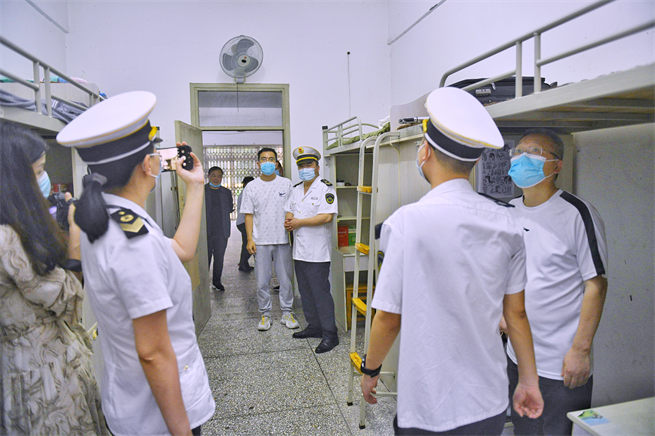 執(zhí)法組隊員檢查考生集中住宿點疫情防控管理。崔力攝