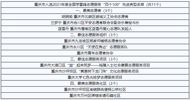 近日,中宣部、中央文明辦等18部門公布了2021年度全國學雷鋒志愿服務“四個100”先進典型名單,重慶3名最美志愿者、3個最佳志愿服務組織、3個最佳志愿服務項目、2個最美志愿服務社區(qū)入選。