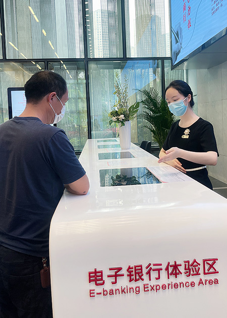 重慶農(nóng)商行工作人員為客戶介紹該行國(guó)際業(yè)務(wù)線上服務(wù)平臺(tái)。重慶農(nóng)商行供圖