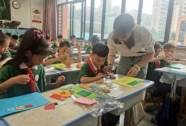 志愿者指導學生制作環(huán)保貼畫。回興街道供圖