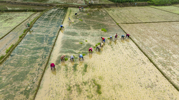 村民們搶抓時節(jié)忙插秧。劉先華攝