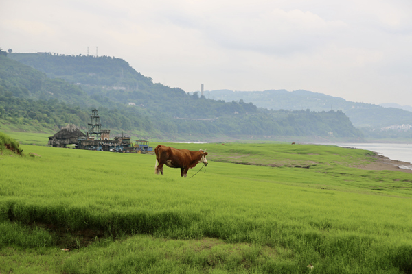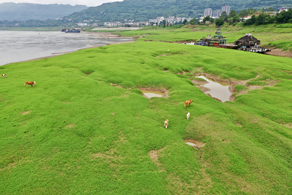 天似穹廬,籠蓋草野,舉目遠(yuǎn)眺,綠色的江岸草原,白鷺飛翔、牛群吃草,生機(jī)勃勃。在長(zhǎng)江涪陵美心紅酒小鎮(zhèn)段,消落帶區(qū)域鋪滿了綠茵草坪一樣的“地毯”。