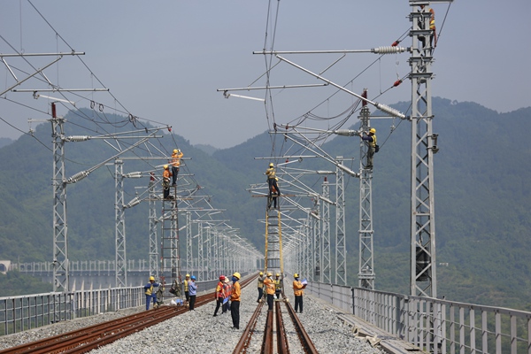 人民網(wǎng)重慶6月16日電 15日上午,在重慶鐵路樞紐東環(huán)線御臨河雙線特大橋上,中國鐵路成都局集團(tuán)公司重慶供電段的職工手持各種工具,正在對(duì)線路供電設(shè)備進(jìn)行檢測(cè)。標(biāo)志著重慶鐵路樞紐東環(huán)線已進(jìn)入線路供電設(shè)備靜態(tài)驗(yàn)收階段,為線路按期開通運(yùn)營做準(zhǔn)備。