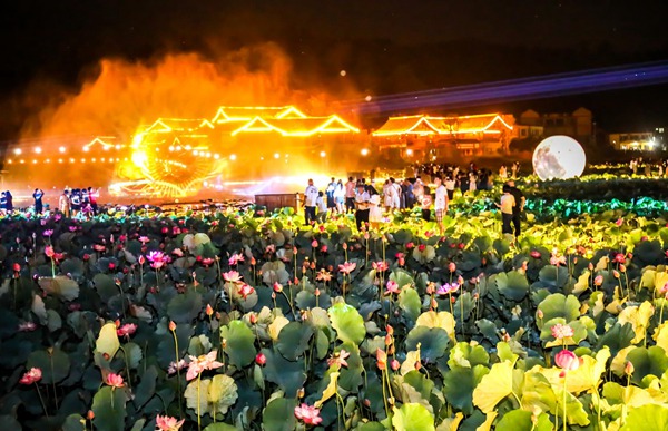 走進(jìn)山灣,一棟棟木欄青瓦的農(nóng)房錯(cuò)落有致,微風(fēng)輕拂,一片片荷葉迎風(fēng)起舞,各色荷花爭(zhēng)芳吐艷,池塘里霧氣升騰,加上別致的鄉(xiāng)村風(fēng)貌和獨(dú)特的燈飾布景,游人穿行其間,猶如游歷仙境一般。