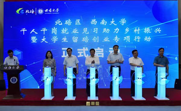 6月17日,北碚區(qū)人民政府、西南大學(xué)聯(lián)合舉行“千人千崗助力鄉(xiāng)村振興暨大學(xué)生留碚創(chuàng)業(yè)專項(xiàng)行動(dòng)”啟動(dòng)儀式。在啟動(dòng)儀式上,西南大學(xué)授予柳蔭鎮(zhèn)、靜觀鎮(zhèn)等7個(gè)單位“就業(yè)見(jiàn)習(xí)基地”牌匾。