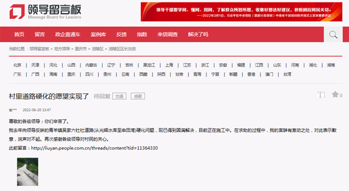 人民網(wǎng)重慶6月22日電 (陳琦)“我去年反映的家鄉(xiāng)道路硬化問題現(xiàn)己妥善解決,感謝各級領(lǐng)導(dǎo)對村民的關(guān)心。”6月20日,一名群眾通過人民網(wǎng)“領(lǐng)導(dǎo)留言板”給重慶市涪陵區(qū)區(qū)長劉忠留言,對自己反映問題的解決表示感謝。【留言原文鏈接】