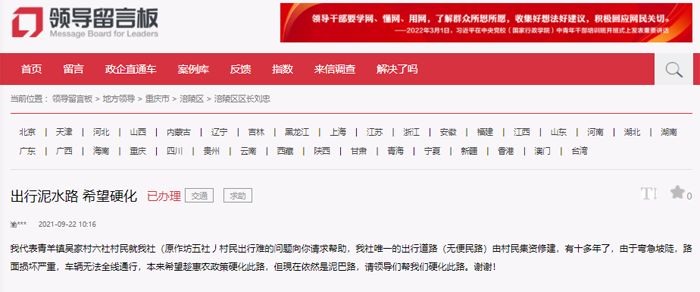 原來,2021年9月22日,這名來自涪陵區(qū)青羊鎮(zhèn)吳家村六社的村民在人民網(wǎng)“領(lǐng)導(dǎo)留言板”進(jìn)行了求助。“我社唯一的出行道路由村民集資修建,有十多年了,由于彎急坡陡,路面損壞嚴(yán)重,車輛無法全線通行,本來希望趁惠農(nóng)政策硬化此路,但現(xiàn)在依然是泥巴路,請領(lǐng)導(dǎo)們幫我們硬化此路。”