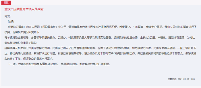 收到留言后,重慶市涪陵區(qū)青羊鎮(zhèn)人民政府對群眾反映的問題高度重視,第一時間進(jìn)行了核實。 “青羊鎮(zhèn)黨政主要領(lǐng)導(dǎo)、分管領(lǐng)導(dǎo)及鎮(zhèn)扶貧辦、公路辦、村黨支部負(fù)責(zé)人等多次現(xiàn)場實地查看,您所反映的社道公路,全長約2公里,未硬化,屬泥結(jié)石道路,為村社集體經(jīng)濟組織負(fù)責(zé)養(yǎng)護(hù)路段。”2021年9月30日,涪陵區(qū)青羊鎮(zhèn)政府在給群眾的回復(fù)中說道。經(jīng)努力協(xié)調(diào),群眾反映道路納入了涪陵區(qū)交通局道路規(guī)劃庫,一旦上級計劃下達(dá),將優(yōu)先硬化該路段,解決群眾出行問題。