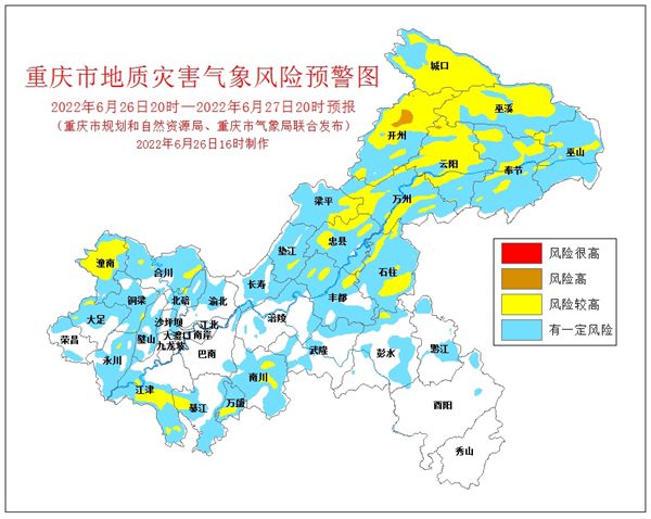 6月26日16時(shí),重慶市規(guī)劃和自然資源局、重慶市氣象局聯(lián)合發(fā)布全市地質(zhì)災(zāi)害氣象風(fēng)險(xiǎn)預(yù)警。