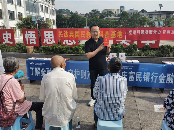 由重慶富民銀行股份有限公司、重慶坤源衡泰律師事務所、民法典國民教育科普基地、重慶兩江新區(qū)藍天救援隊、大灣鎮(zhèn)龍洞巖村黨支部聯合組織的“黨建引領凝聚合力·普惠發(fā)展富惠民生”黨支部聯學共建活動在渝北大灣鎮(zhèn)舉行,通過現場開展金融知識、法律知識、急救知識等講座,發(fā)放金融消費者權益保護、征信、反洗錢、民法典普法讀物等宣傳資料,不斷提升農村地區(qū)居民金融知識和金融技能,以及增強其法律風險防范意識和安全意識。