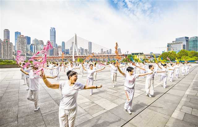 當(dāng)日,第五屆川劇節(jié)活動之一的廣場舞表演在成渝兩地同期舉行。來自重慶、四川兩地的10支廣場舞隊(duì)伍來到重慶市人民大禮堂廣場,成都桂溪生態(tài)公園等10個(gè)文化地標(biāo)、商圈、景區(qū)等地表演,以飽滿的熱情展現(xiàn)川渝人民對于川劇藝術(shù)的喜愛之情。