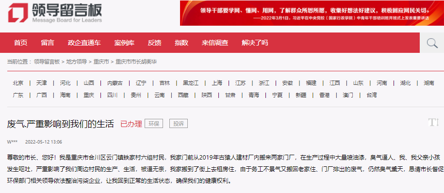 網(wǎng)友在留言中表示,其是合川區(qū)云門鎮(zhèn)鐵家村六組村民。“我家門前2019年從古猿人建材廠內(nèi)搬來兩家門廠,在生產(chǎn)過程中大量噴油漆,臭氣逼人。嚴重影響了我們周邊村民的生產(chǎn)、生活。”該網(wǎng)友稱,因異味擾民,一家人搬到了街上去租房住了一段時間,搬回老家后,發(fā)現(xiàn)門廠排出的廢氣,仍然臭氣熏天。“懇請市長督促環(huán)保部門依法整治污染企業(yè),讓我回到正常的生活狀態(tài),確保我們的健康權(quán)利。”