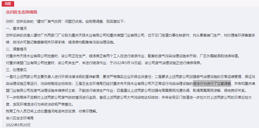 合川區(qū)生態(tài)環(huán)境局在回復(fù)中表示,已對兩家公司主要負責人進行了環(huán)保法律法規(guī)的宣傳教育,要求嚴格落實企業(yè)環(huán)保主體責任;加強廢氣治理設(shè)施的日常運維管理,保證污染治理設(shè)施正常運行,污染物穩(wěn)定達標排放。