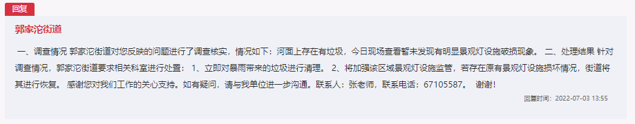 7月3日,經(jīng)現(xiàn)場(chǎng)實(shí)地調(diào)查,郭家沱街道回應(yīng)稱,河面上存在有垃圾,現(xiàn)場(chǎng)查看暫未發(fā)現(xiàn)有明顯景觀燈設(shè)施破損現(xiàn)象。針對(duì)調(diào)查情況,郭家沱街道要求相關(guān)科室立即對(duì)暴雨帶來(lái)的垃圾進(jìn)行清理。同時(shí),將加強(qiáng)該區(qū)域景觀燈設(shè)施監(jiān)管,若存在原有景觀燈設(shè)施損壞情況,街道將進(jìn)行恢復(fù)。