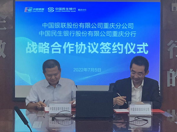 7月5日,中國(guó)民生銀行重慶分行與中國(guó)銀聯(lián)重慶分公司舉行戰(zhàn)略合作協(xié)議簽約儀式。