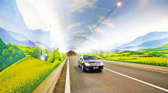 7月30日,城開高速城口縣雞鳴鄉(xiāng)至開州區(qū)譚家鎮(zhèn)段正式開通。圖為車輛從城開隧道3D裸眼彩繪段駛過。記者 羅斌 攝/視覺重慶