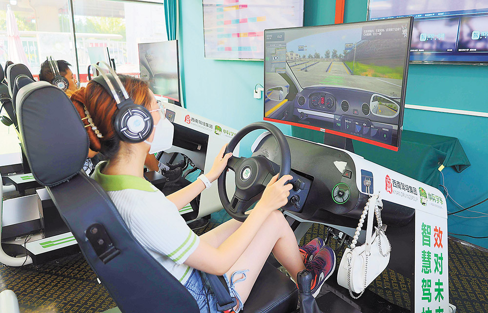8月9日,在位于沙坪壩區(qū)的西南駕培集團鼎吉駕校智能駕駛體驗中心,學(xué)員們在AI智能模擬機上進行科目二訓(xùn)練。