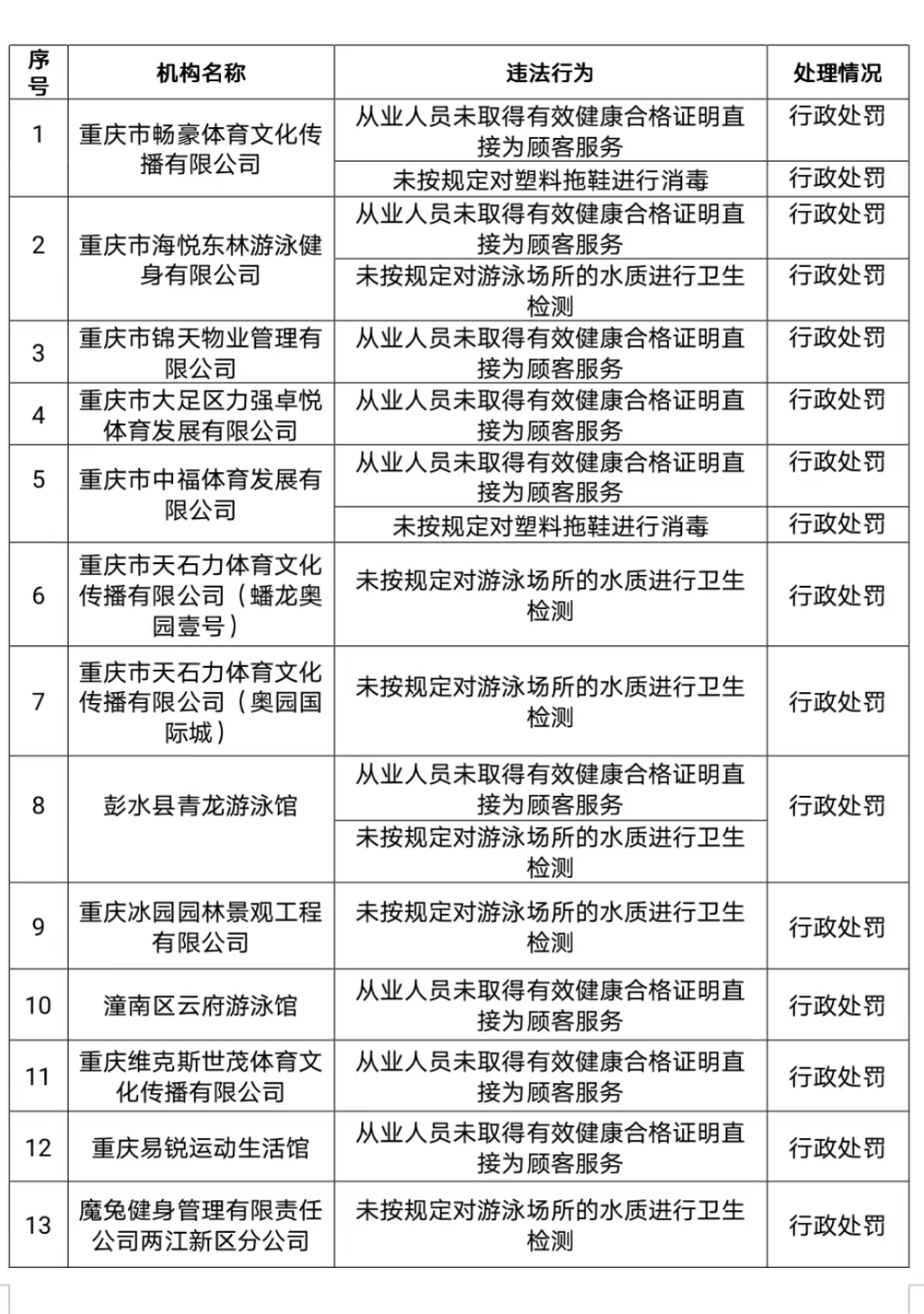 接下來,相關(guān)區(qū)縣衛(wèi)生和體育部門將及時跟進(jìn)32家存在問題的游泳場所整改落實情況,確保相關(guān)問題得到整改解決,并對重慶市海悅東林游泳健身有限公司、重慶市暢豪體育文化傳播有限公司、重慶維克斯世茂體育文化傳播有限公司、重慶易銳運(yùn)動生活館等13家存在違法違規(guī)行為的游泳場所進(jìn)行行政處罰,切實讓群眾安“夏”心、“游”放心。
