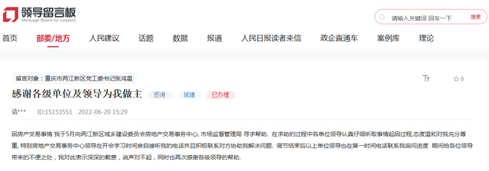 群眾留言感謝信?!邦I(lǐng)導(dǎo)留言板”截圖