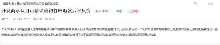 在此前反映情況的留言中,李先生稱他于2022年4月4日在兩江新區(qū)空港大道某樓盤銷售部看房過程中,銷售人員承諾只需首付兩成即可購房,可是當他簽訂2萬元的認購協(xié)議一個禮拜后,銷售人員卻通知他需要付三成?!拔腋嬷N售人員沒有三成的錢,他們卻提出一些不合理的行為表示可以幫忙解決資金問題。被我當即拒絕后,對方仍然不退還兩萬元認購金。請領(lǐng)導(dǎo)為我做主,退還兩萬元認購金?!?a target="_blank" rel="noopener">【留言原文鏈接】
