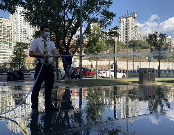 萬物人灑水沖地,為核酸采集點提前降溫。萬物云供圖