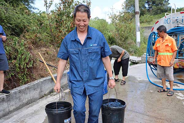 市水投集團(tuán)渝水股份璧山村鎮(zhèn)公司八塘水廠廠長(zhǎng)幫村民把水提到家門口。市水投集團(tuán)?供圖