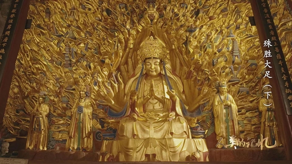 《殊勝大足》的創(chuàng)作者們對(duì)此進(jìn)行了深刻體悟和精準(zhǔn)拿捏,他們以一年為期,反復(fù)推敲打磨,以創(chuàng)作的匠心誠(chéng)意向千年的文脈傳承致敬??v觀全片,無(wú)論是專家學(xué)者的鉤沉索隱,還是珍貴史料的探幽發(fā)微;無(wú)論是磁性厚重的畫外配音,還是與鏡頭畫面和諧融洽的音樂(lè)設(shè)計(jì);無(wú)論是十大明王造像的金剛怒目,還是千手觀音造像的菩薩低眉,《殊勝大足》呈現(xiàn)給觀眾質(zhì)樸靜雅、深邃沉郁的影像氣質(zhì),與大足石刻所特有的雍容偉岸、凝練節(jié)制的美學(xué)基調(diào)高度契合。在光影流轉(zhuǎn)的舒緩節(jié)奏中,大美不言的石刻畫卷鋪展開來(lái),動(dòng)人心魄的石刻故事娓娓道來(lái),情節(jié)敘事不疾不徐、不蔓不枝,引領(lǐng)全片的藝術(shù)氣息隨時(shí)間慢慢流淌,給觀眾以美的享受和啟迪。尤其值得一提的是,全片的解說(shuō)詞敘事脈絡(luò)紋理清晰,遣詞用句精準(zhǔn)到位,通篇閃耀著思想的光輝,浸潤(rùn)著文學(xué)的雅致,堪稱同類題材紀(jì)錄片解說(shuō)詞的樣本。