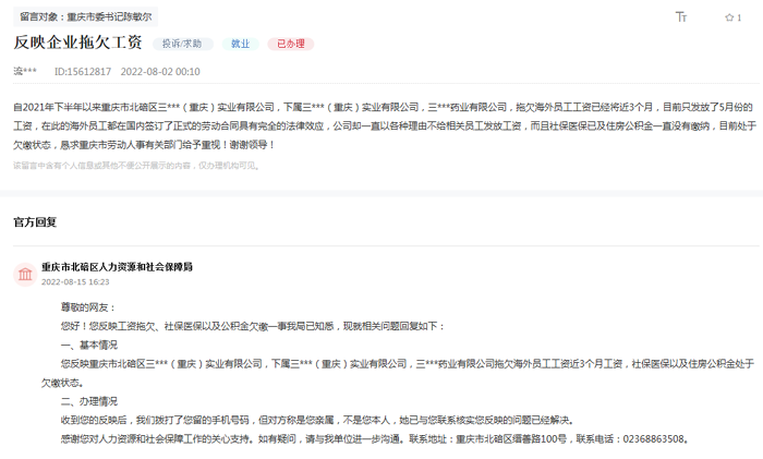 一位網(wǎng)友留言:“自2022年下半年以來重慶市北碚區(qū)一公司,拖欠海外員工工資已近3個(gè)月,目前只發(fā)放了5月份的工資,而且社保醫(yī)保以及住房公積金一直沒有繳納,目前處于欠繳狀態(tài),懇求重慶市勞動(dòng)人事有關(guān)部門給予重視!”