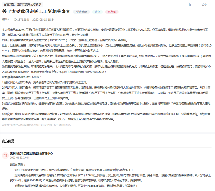 “您反映的濱江教育大廈項(xiàng)目拖欠您母親工資事宜,濱江集團(tuán)分別與項(xiàng)目總承包單位、勞務(wù)單位、班組長古某進(jìn)行核實(shí)和協(xié)調(diào),所欠您母親工資1240元,已于2022年8月17日通過微信轉(zhuǎn)賬方式支付至您母親微信賬號(hào)。給您和您家人帶來的不便,請您諒解。”