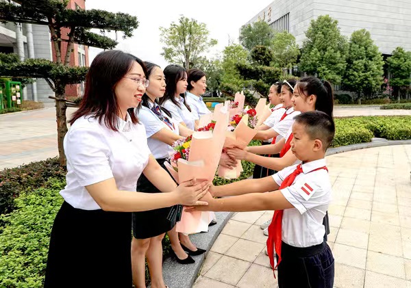 永川五洲小學(xué)學(xué)生向今年受區(qū)教委表彰的教師獻花。永川區(qū)教委供圖