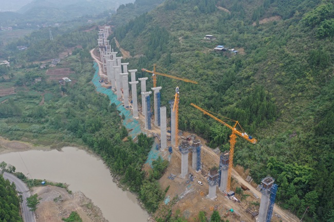 巫云開高速雙河口特大橋是全線重點控制性控制性工程之一,該大橋位于云陽縣沙市鎮(zhèn)雙河口,左幅全長748米,右幅全長820米,主跨200米,是全線單跨跨徑最大的橋梁,其主墩也是全線最高的,達162.1米。